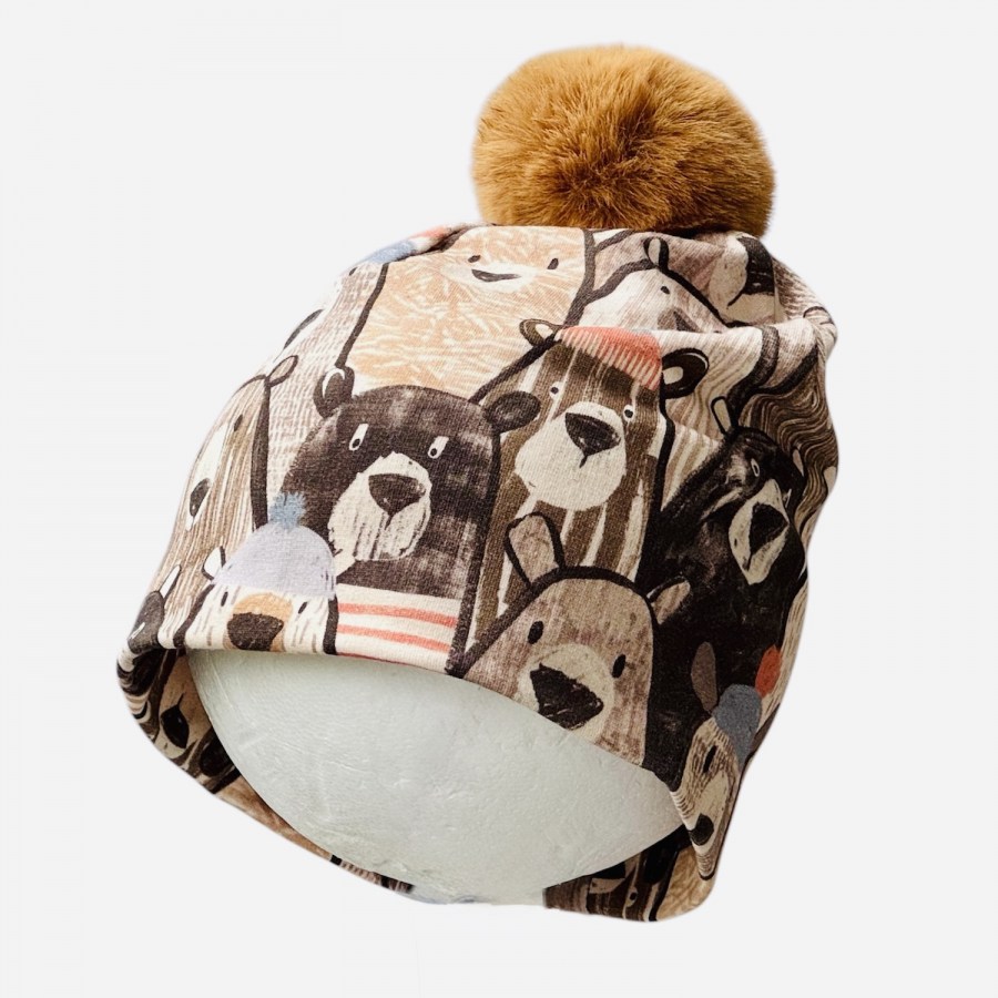 Nalle-kuvioinen pipo ommeltu pehmestä ja ohuehkosta joustavasta collegekankaasta, materiaaliltaan trikoopipoa paksumpi.