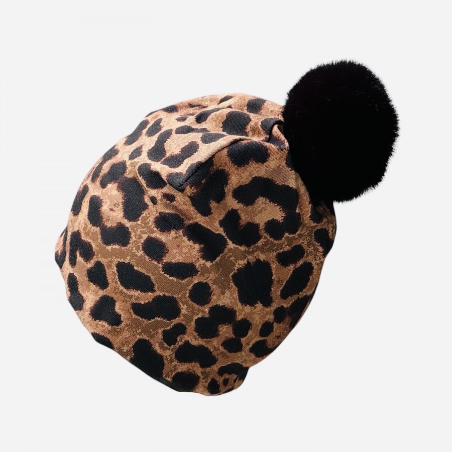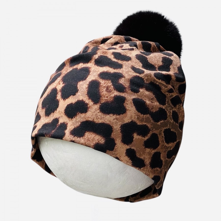 Leopardikuvioinen pipo mustalla tupsulla