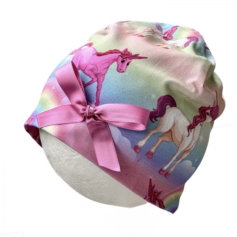 Yksisarvis/sateenkaari-kuvioinen pipo rusetilla, kuviot aasettuvat eri pipoissa eri kohtiin