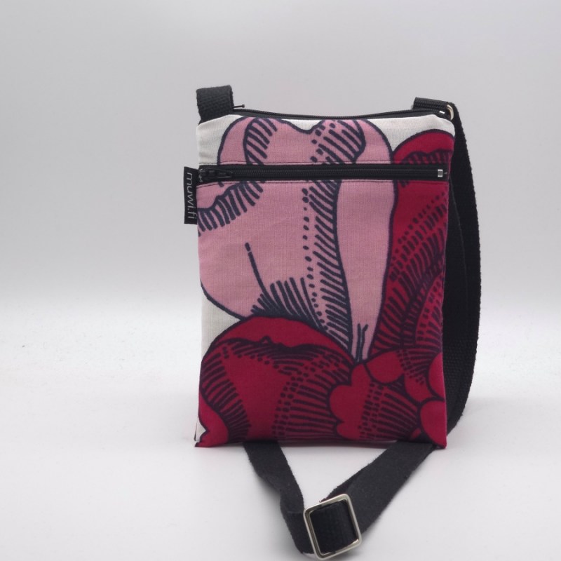Pienen olkalaukun koko on n.16x20cm, sivussa lähes laukun syvyinen vetoketjutasku. Laukku on puuvillaa, puuvillavuorilla. Olkahihna säädettävissä 75-150cm. Tähän mahtuu vaikka kännykkä, avaimet ja kukkaro.