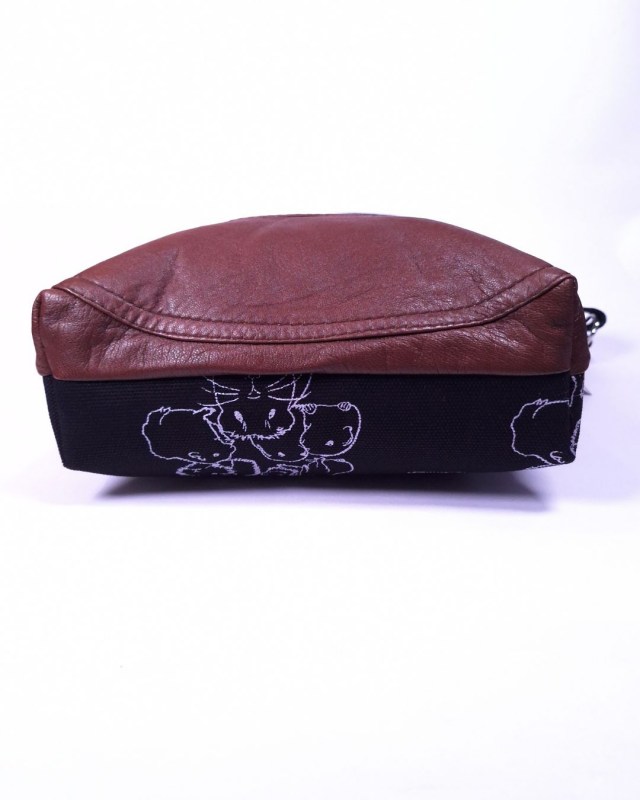 Valmistettu vanhoista nahkatakeista ja vuorattu pehmeällä tikkivanulla, sivutaskussa musta puuvillavuori.