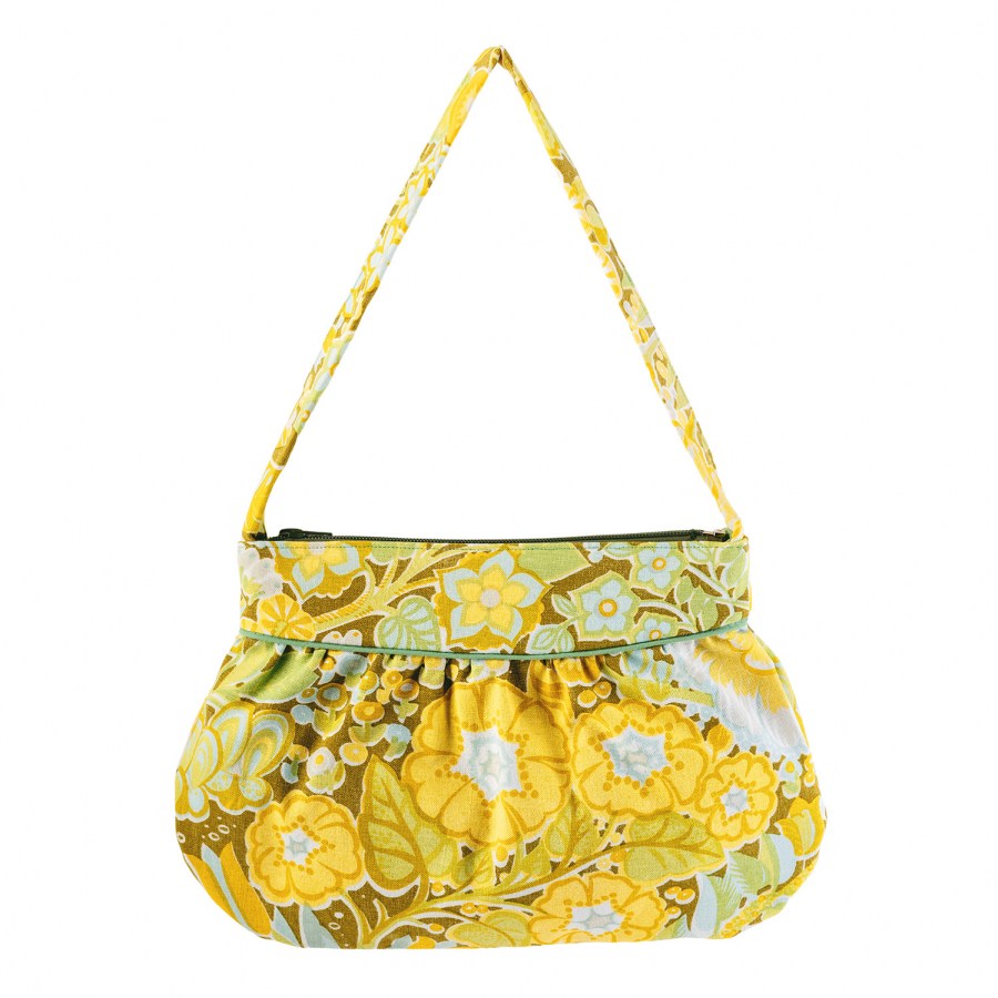 Vihreäkeltainen kierrätyskankaasta valmistettu laukku.