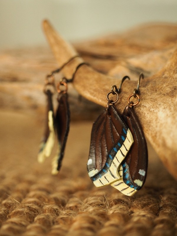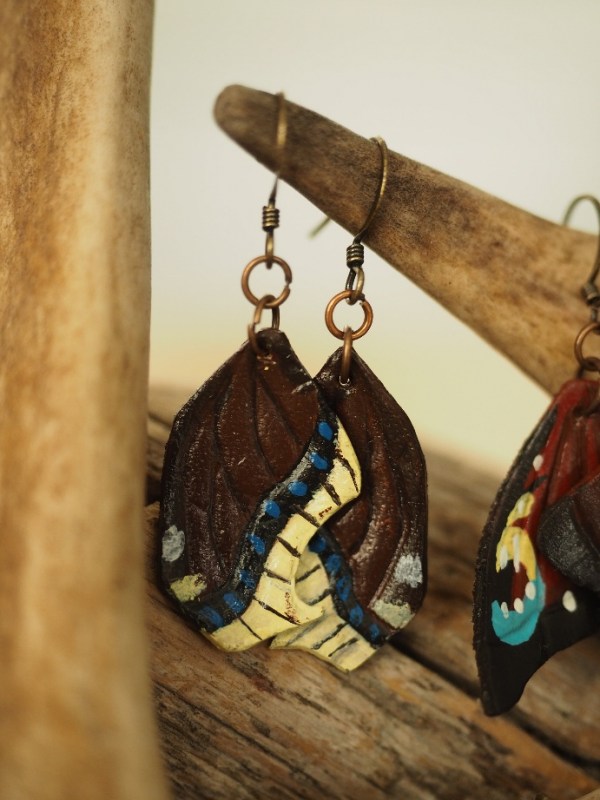 Kotimaisesta nahasta muotoillut ja käsinmaalatut. Kokonaispituus 4,5 cm. Koukut ovat nikkelivapaata terästä.