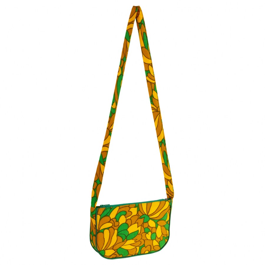 Pieni vihreäkeltainen kierrätyskankaasta valmistettu pitkähihnainen laukku.
